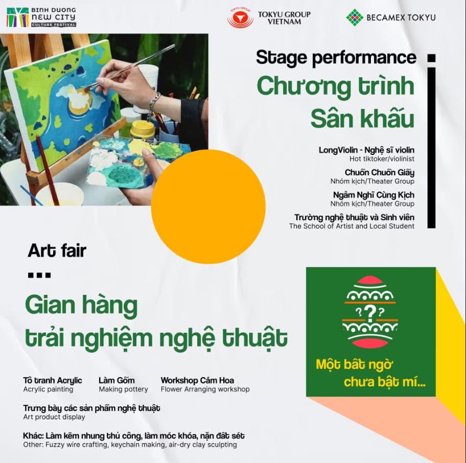 Là một phần trong chuỗi sự kiện Binh Duong New City Culture Festival lần 3 với chủ đề “Art in the City”, Art Fair mang đến một hành trình nghệ thuật đa sắc màu, từ trải nghiệm thủ công độc đáo đến những màn trình diễn ấn tượng, nơi để chậm rãi tận hưởng, nuông chiều cảm xúc và đắm mình trong không gian sáng tạo.
